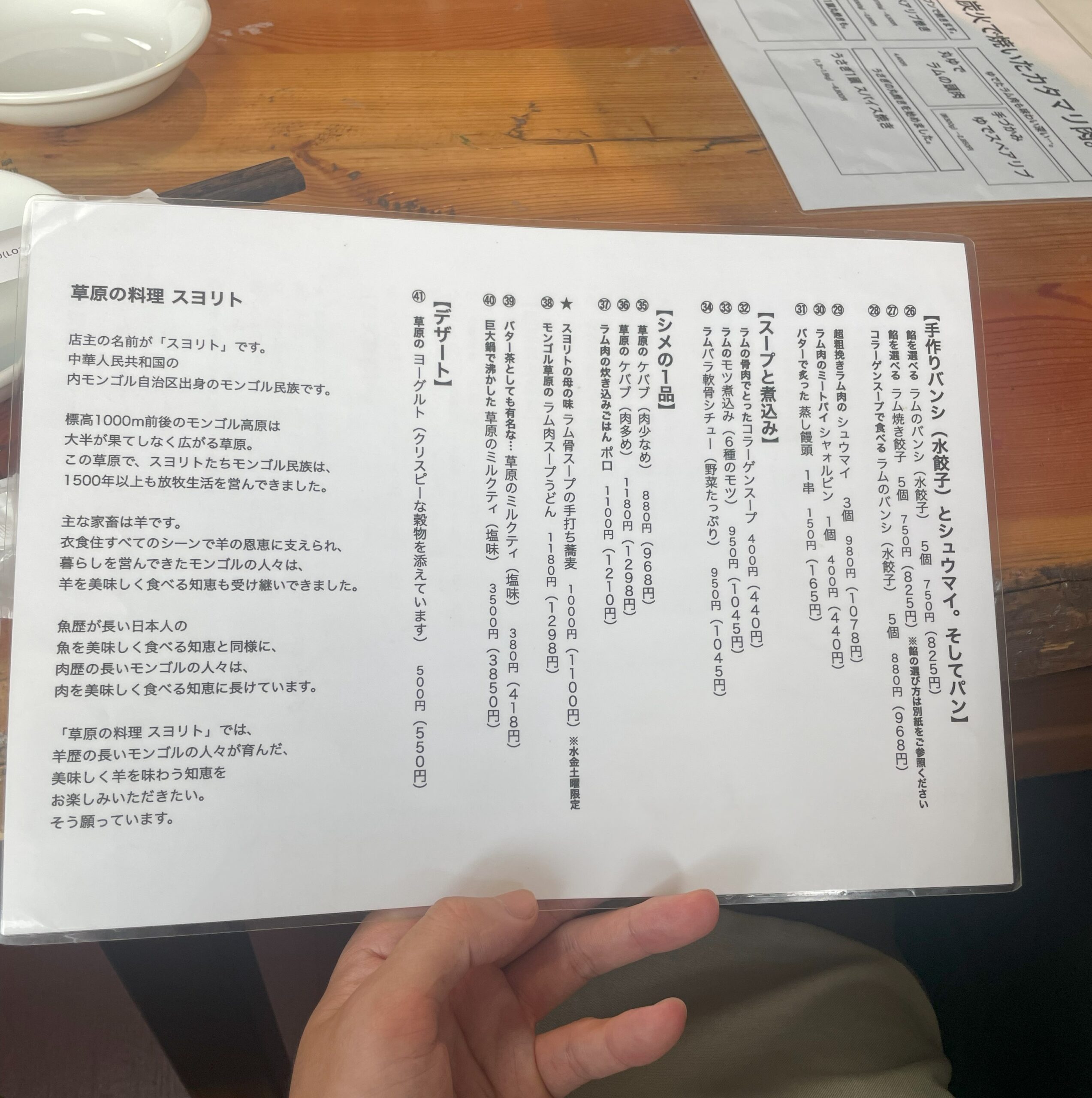 こちらのお店は本格的なモンゴル料理を提供するお店で、食べログの「アジア・エスニックTOKYO百名店2023」にも選出されたこともあります。店名のスヨリトは店主の名前からとっているそうです。